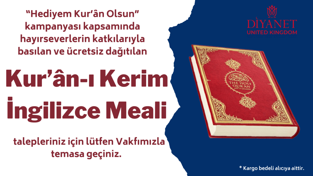 “Hediyem Kur’ân Olsun” kampanyası kapsamında hayırseverlerin katkılarıyla basılan ve ücretsiz dağıtılan Kur’ân-ı Kerim İngilizce Meali talepleriniz için lütfen Vakfımızla temasa geçiniz.